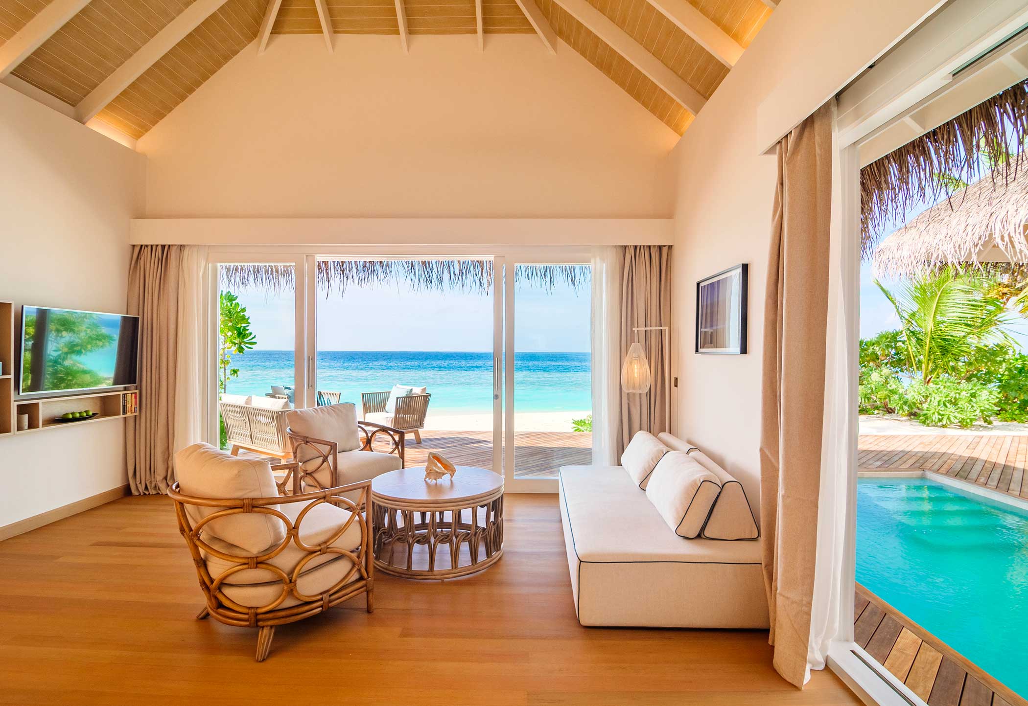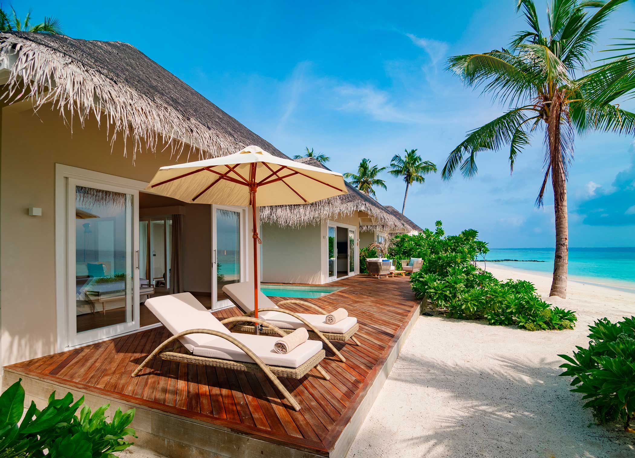 Просторные водные виллы или виллы на пляже с прямым доступом к пляжу, с уютными террасами. Есть виллы с собственным бассейном с пресной водой.